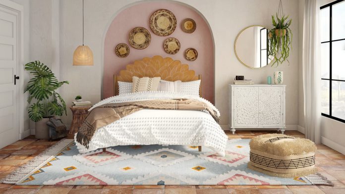 As already explained, Boho design has a very thick ethnic element. There are several items with an ethnic appearance that can make a bedroom look attractive, such as ethnic and colorful rugs.